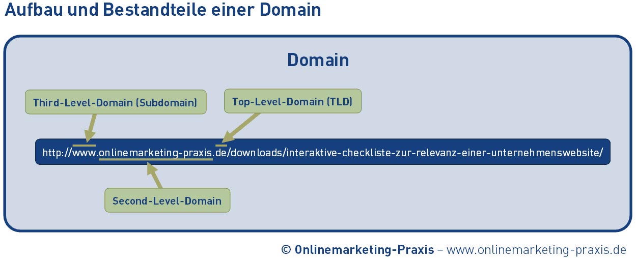 Die Domain ist der weltweit eindeutige Name einer Website. Eine komplette Domain besteht aus Third-Level-Domain (Subdomain), Second-Level-Domain und Top-Level-Domain (TLD).
