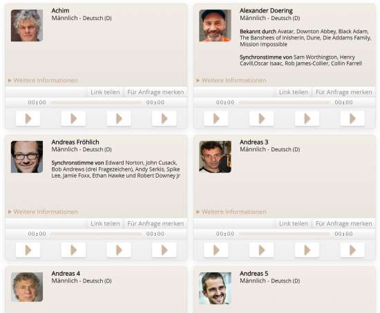 Je nach Einsatzzweck wählen Sie die Art der Produktion aus. Manche Inhalte wirken sehr gut, wenn sie selbst erstellt werden. Das gibt eine Nähe und ist authentisch. Andere Maßnahmen verlangen eine professionelle Machart. Das gilt nicht nur für das Video, sondern auch für Audio. Manchmal muss es eben auch ein professioneller Sprecher oder Sprecherin sein. Dienstleister für Videoproduktionen gibt es viele. Und es gibt auch Agenturen und Datenbanken für Sprecher und Sprecherinnen. Hier eine Datenbank für Sprecher für Werbung. Dort kann man sich auch passende Stimmen auswählen und Stimmproben anhören.![]()