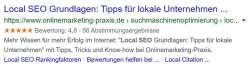 - Bewertungen in den lokalen Treffern beinhalten ausschließlich Bewertungen über das Bewertungssystem von Google. Und diese sind sogar relevant für das Ranking in den lokalen Ergebnissen. Im Artikel "Local SEO Grundlagen: Tipps für lokale Unternehmen" erfahren Sie dazu mehr.
