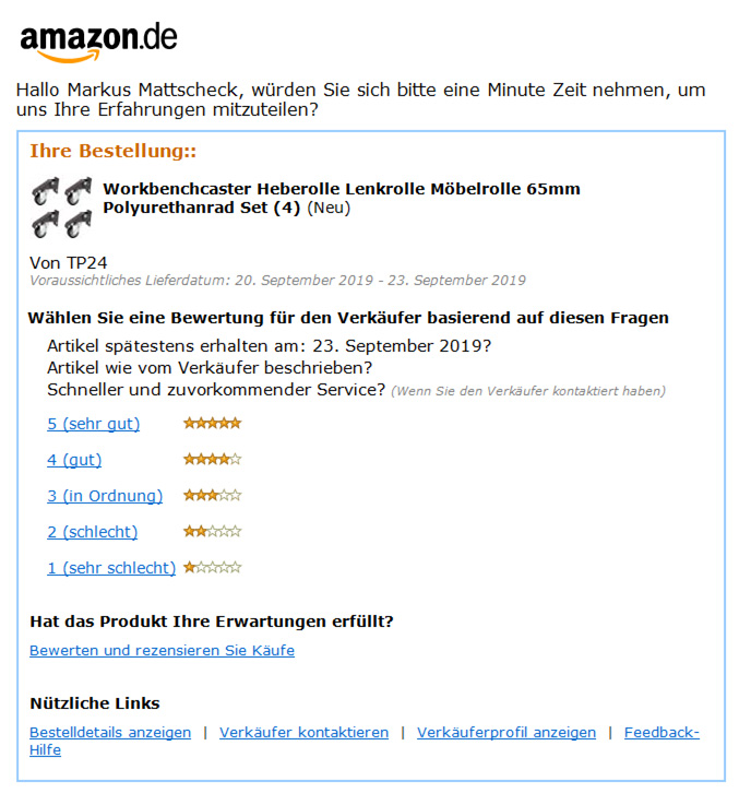 Nahezu alle Shopsysteme können automatisierte E-Mails an Kunden versenden. Hier kann auch eine E-Mail mit einer Aufforderung zur Bewertung eingerichtet werden. Oder Sie verbinden Ihr CRM-System mit einem Tool zur E-Mail-Automation.